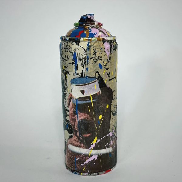 Découpage collage sur bombe recyclée (vide et inerte de tout résidus-gaz et peinture)de vignette personnages héros de bandes dessinées, dessins animés (ici datant d’une bd de 1964) ou série tv etc…sur fond de vignettes issues de bd érotique pour adultes vintage de années 80 et trashing à la bombe aérosol.